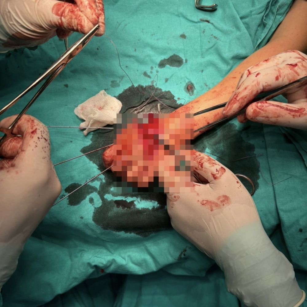 В процессе хирургического вмешательства была обнаружена травма сухожилий разгибателя и повреждения ветвей лучевого нерва.Для восстановления функций правого руки был приглашён нейрохирург, который успешно произвёл ревизию и ушивание повреждённых ветвей лучевого нерва.