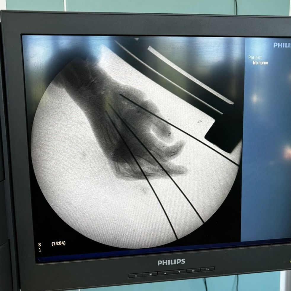 Врачебная команда провела репозицию осколков первой, второй и третьей пястных костей, фиксируя их спицей Киршнера диаметром 2,0 мм, с учетом необходимой компрессии.