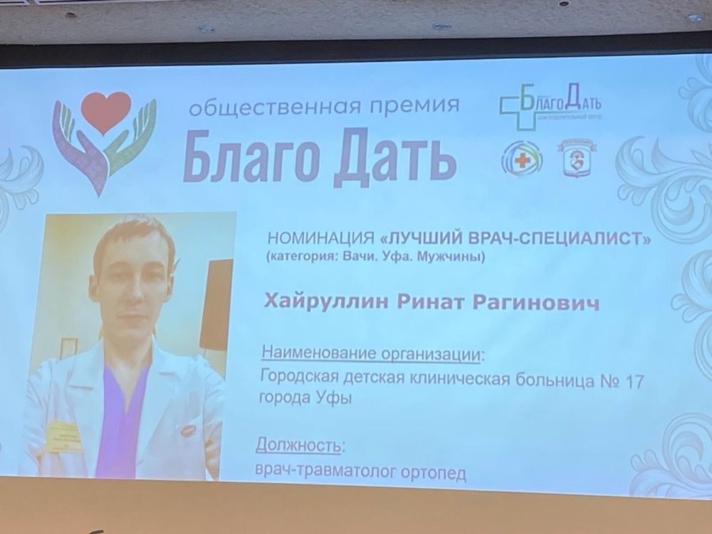 Благотворительный фонд «БлагоДать» наградил нашего специалиста Хайруллина Рината Рагиновича — врача-травматолога-ортопеда!
